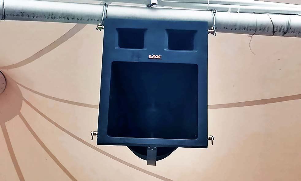 考慮到操場區域,要求聲場均勻,LAX選用4組(4只雙8線性陣列音箱AT208+1只雙15寸超低頻音箱AT215B)作為主擴音響吊掛在主席臺左右兩側,選用遠程號角音箱PS3作為觀眾席補聲吊掛在主席上方兩側,經過精確擴聲角度調整,能夠確保操場主席臺、觀眾區及運動場區域覆蓋均勻、聲音準確、音質清晰。