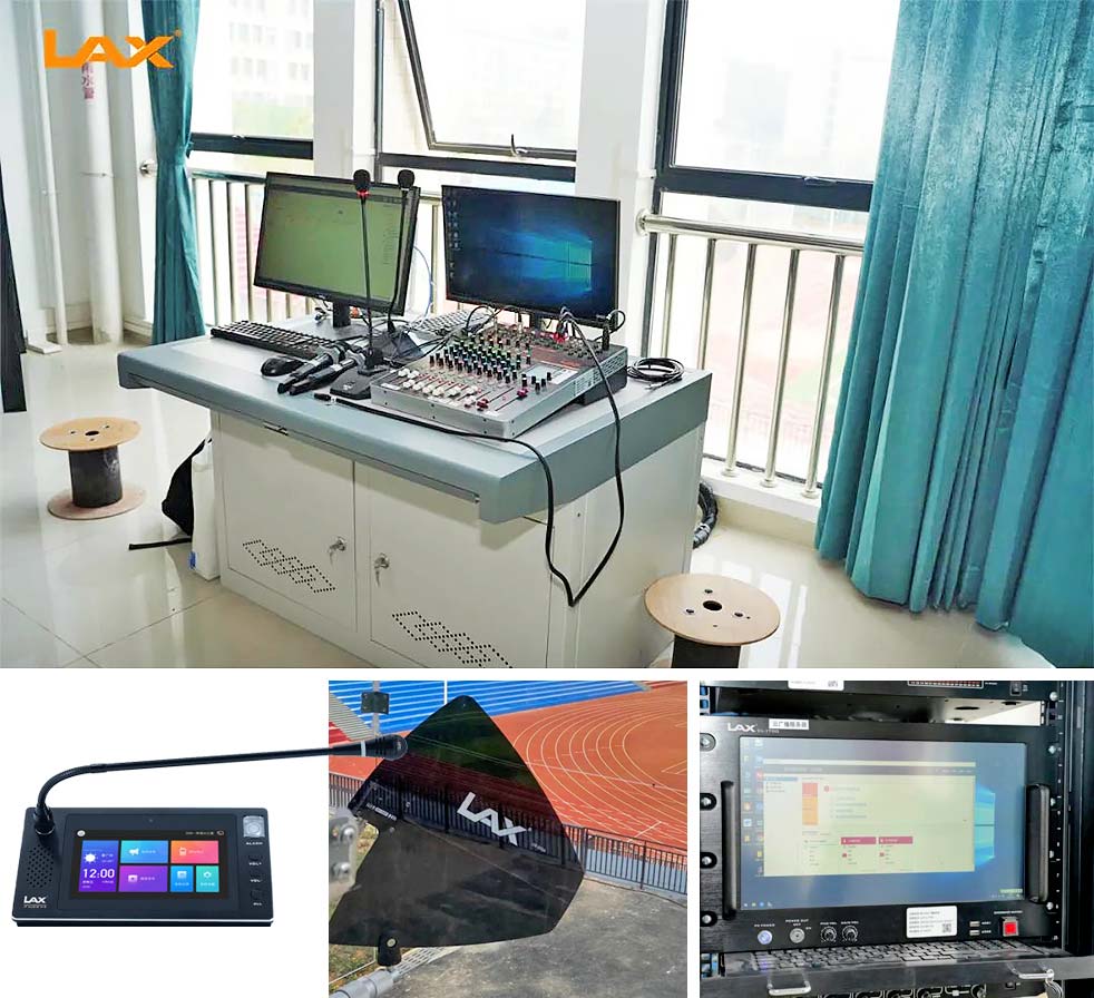 運動場采用18只120W戶外防水音柱,平均分布400米跑道圈內,使用2臺1500W功放驅動,設備放置廣播站內。