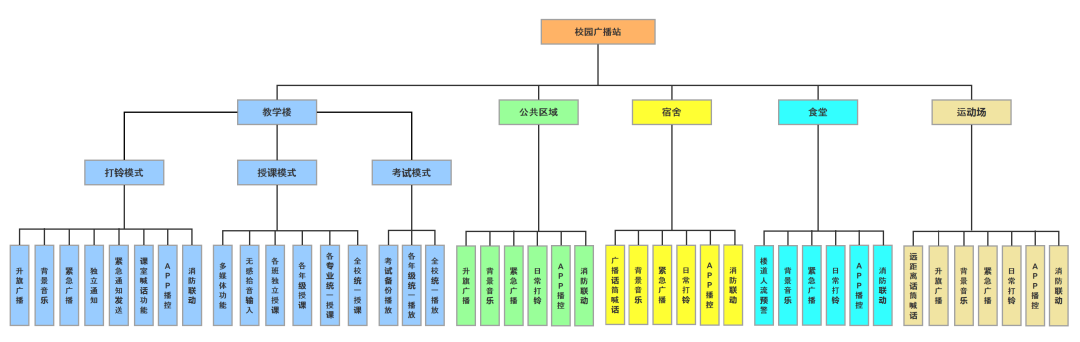 功能區域模塊化分區組合,自由編組,教室點對點廣播,預留應急廣播系統。