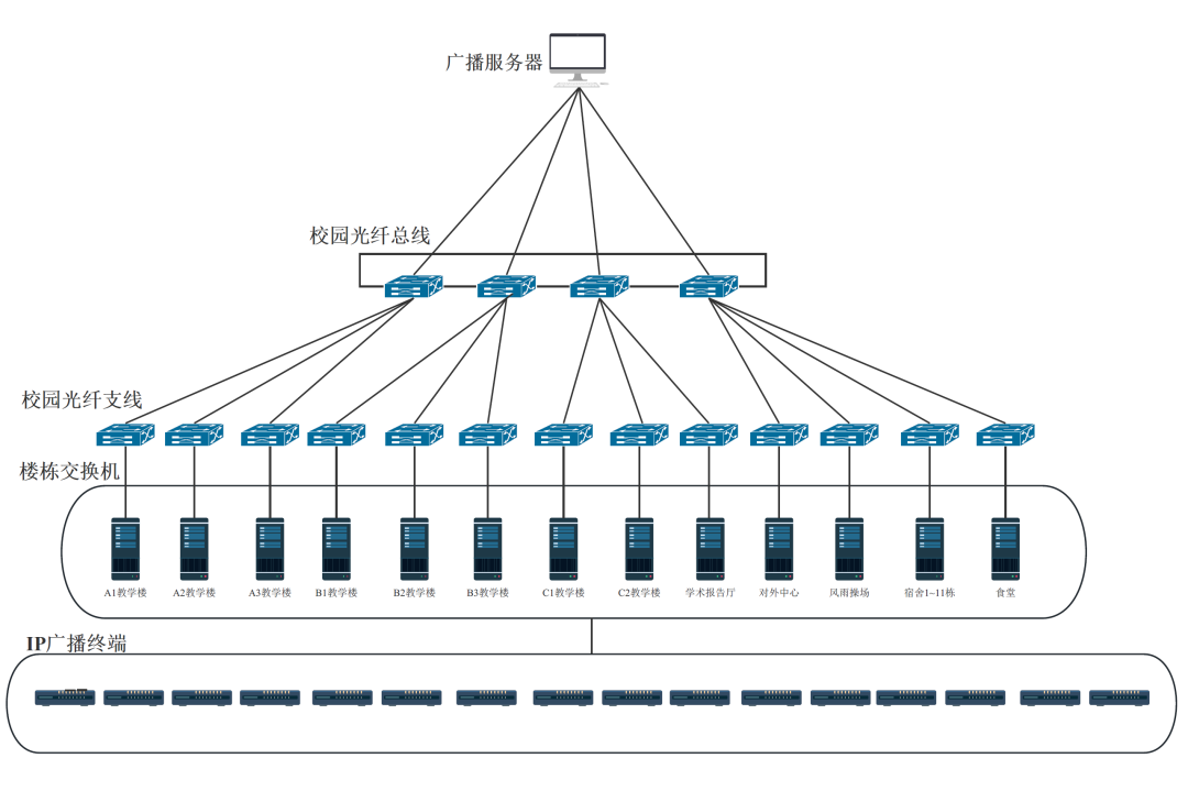 通過學校預埋光纖,每棟建筑的廣播網絡匯聚至行政綜合樓6樓。每棟建筑一樓使用2路光纖(一主一備),配置光口交換機,樓層網口較多的在樓層3樓做分層交換機,每間課室及實訓室獨立布網線至樓層弱電間,實現獨立的廣播網絡局域網。