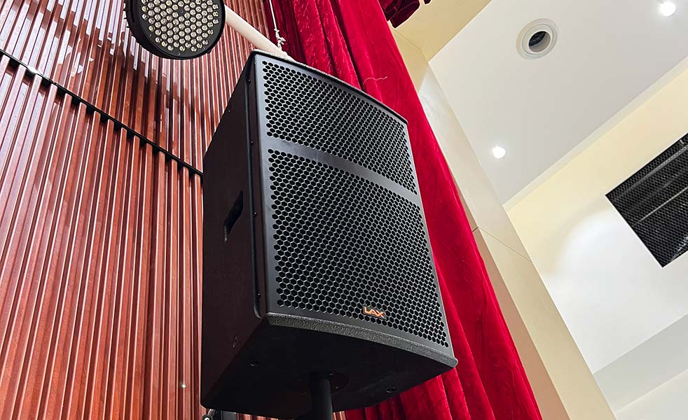 固定返聽音箱選用LAX AT12M專業返聽音箱,吊掛式安裝于舞臺內左右兩側,調整一定角度,能夠覆蓋主席臺的講話者及臺前聽眾,讓聲場覆蓋更加均勻。
