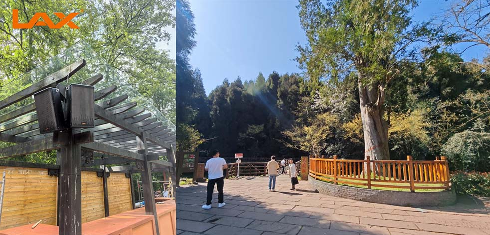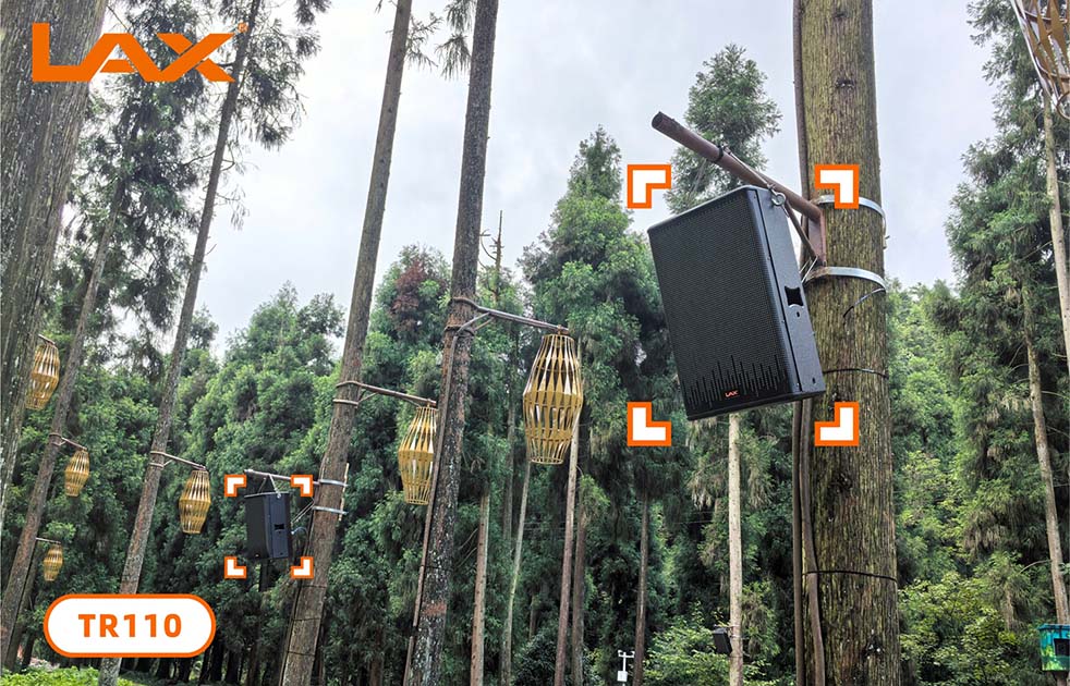 在百年古樹旁邊一個(gè)廊亭上,桿頂掛采用兩只TR110定制版全天候防水全頻揚(yáng)聲器,音源跟隨投影畫面同步控制。