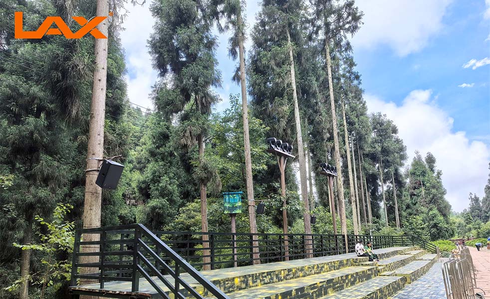 在熒光棧道、熒光科普館、出發(fā)-卵、歧途森林步道、寺廟外墻等,采用LX-352戶外防水廣播音柱,用抱箍的方式安裝在樹干上,作為每個(gè)區(qū)域的背景音樂擴(kuò)聲系統(tǒng)。使用物聯(lián)網(wǎng)系統(tǒng)智能化控制,保證每一個(gè)區(qū)域定時(shí)播放不同的音樂,進(jìn)行單點(diǎn)區(qū)域的背景擴(kuò)聲。