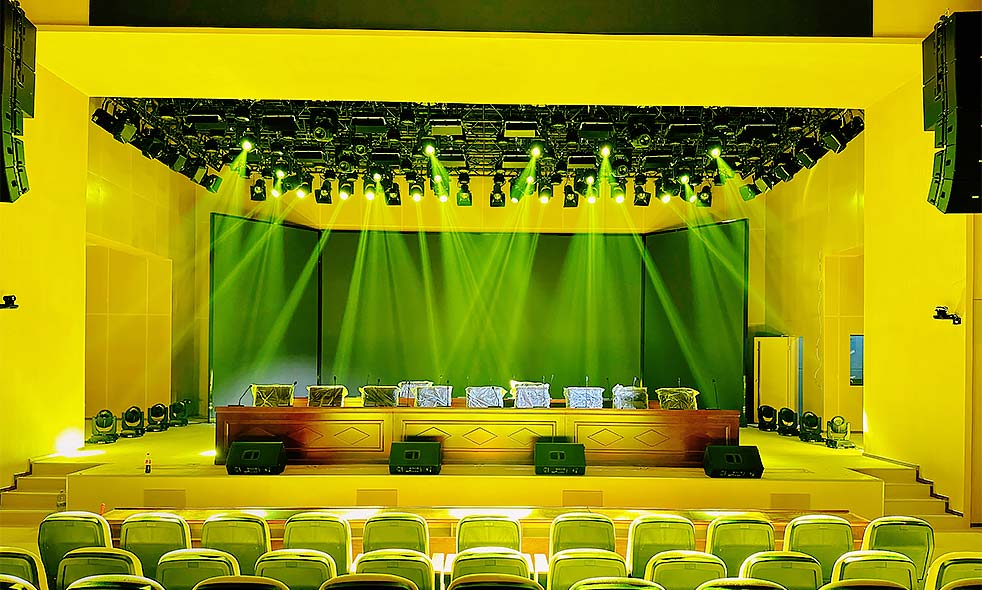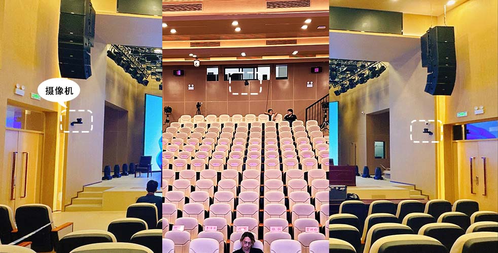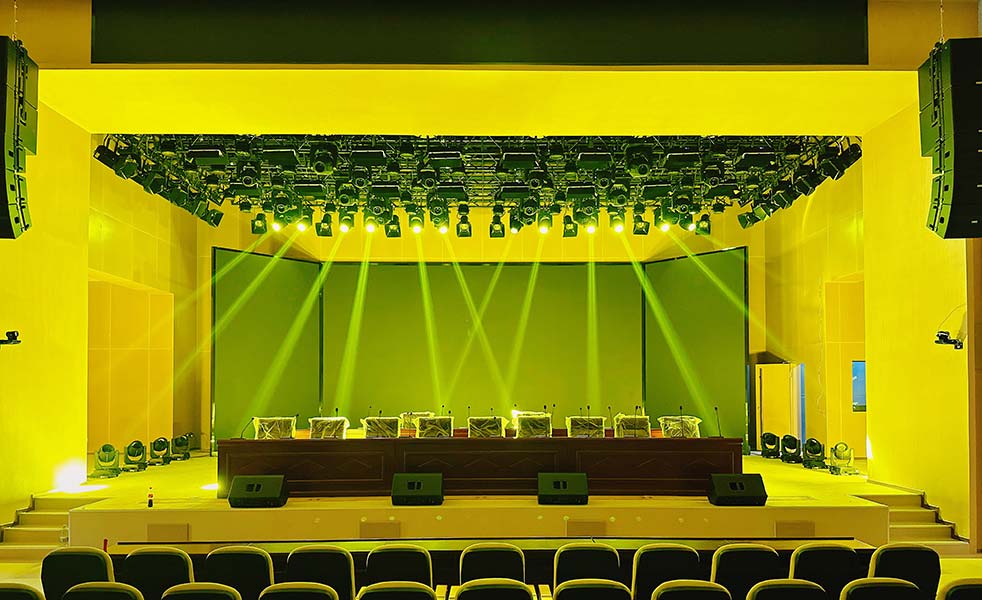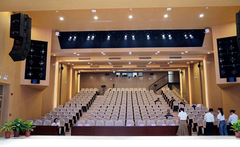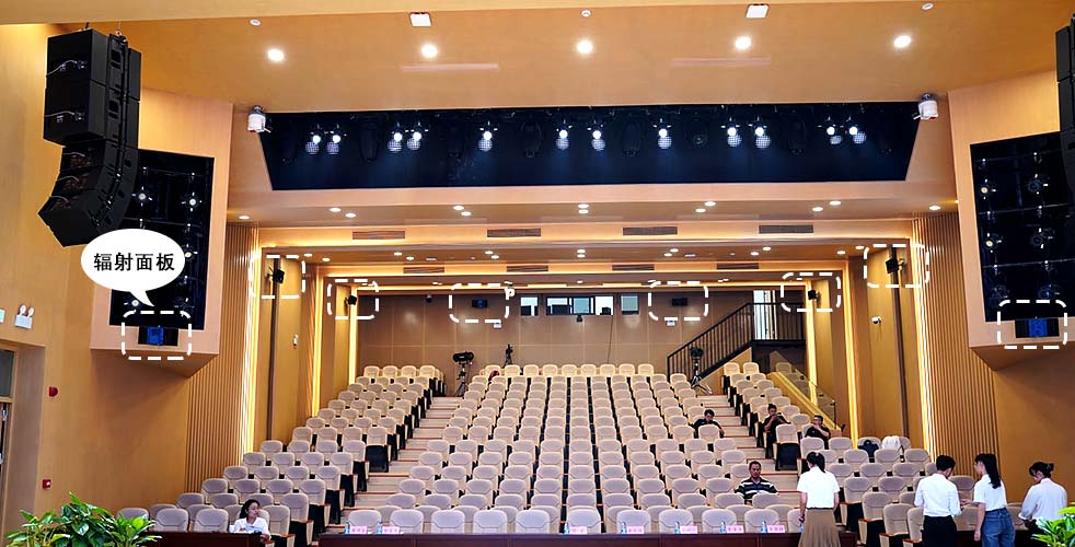 報告廳主擴聲揚聲器選用兩組12寸線陣音響組,每組由3只12寸全頻音響+2只18寸超低揚聲器組成,吊掛安裝在舞臺左右兩側,實現觀眾區的均勻聲場覆蓋。