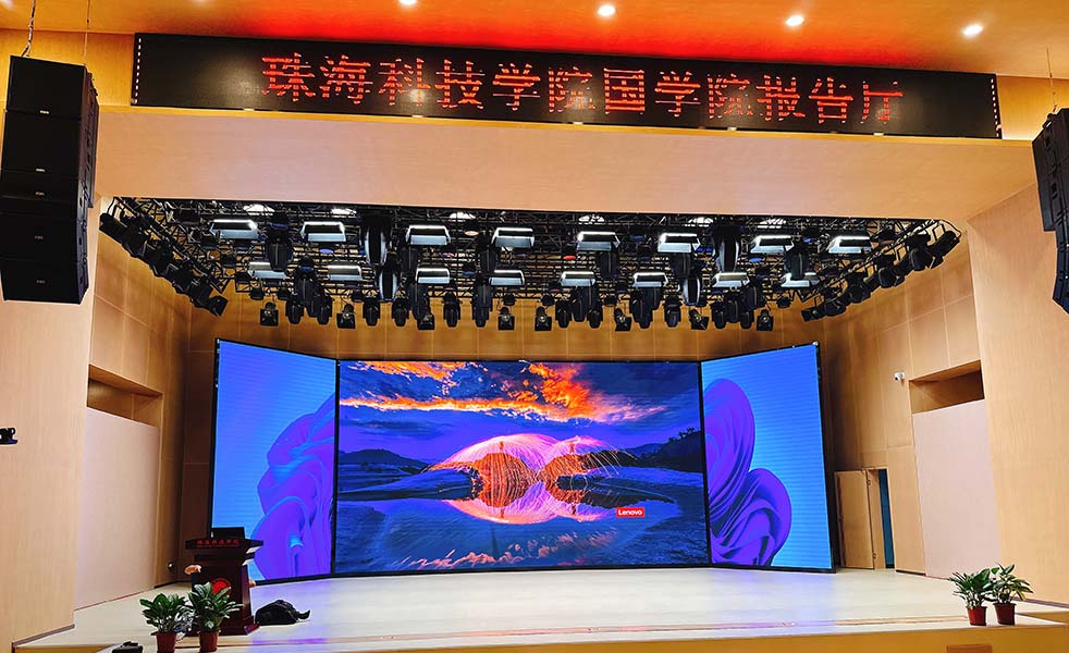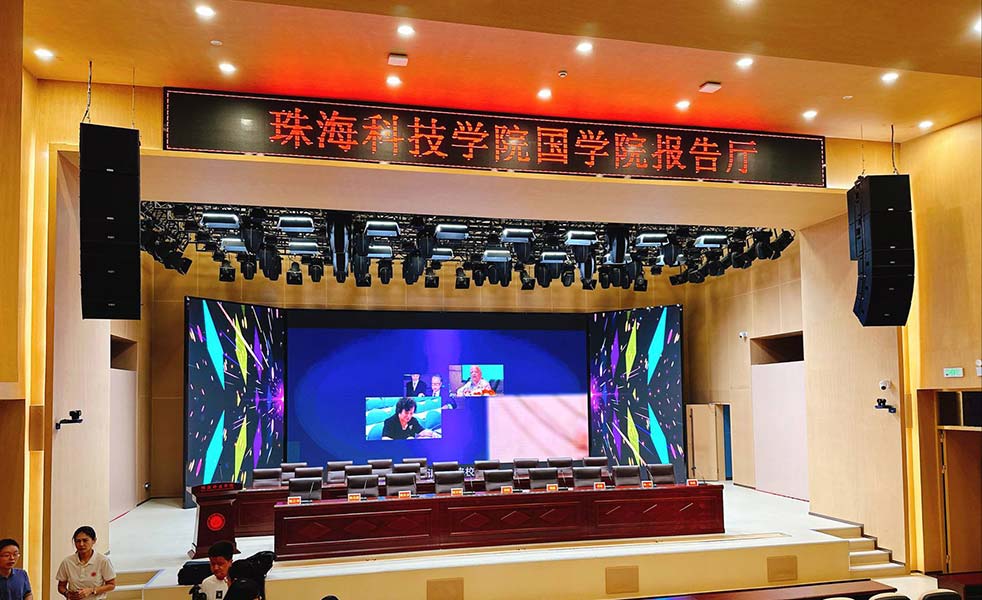 我司為珠海科技學院國學院報告廳提供LED顯示系統、燈光系統、擴聲系統、會議錄播系統、無線數字會議系統、遠程視頻會議系統、無紙化會議系統、電子桌牌、同聲傳譯系統、中控管理系統解決方案。