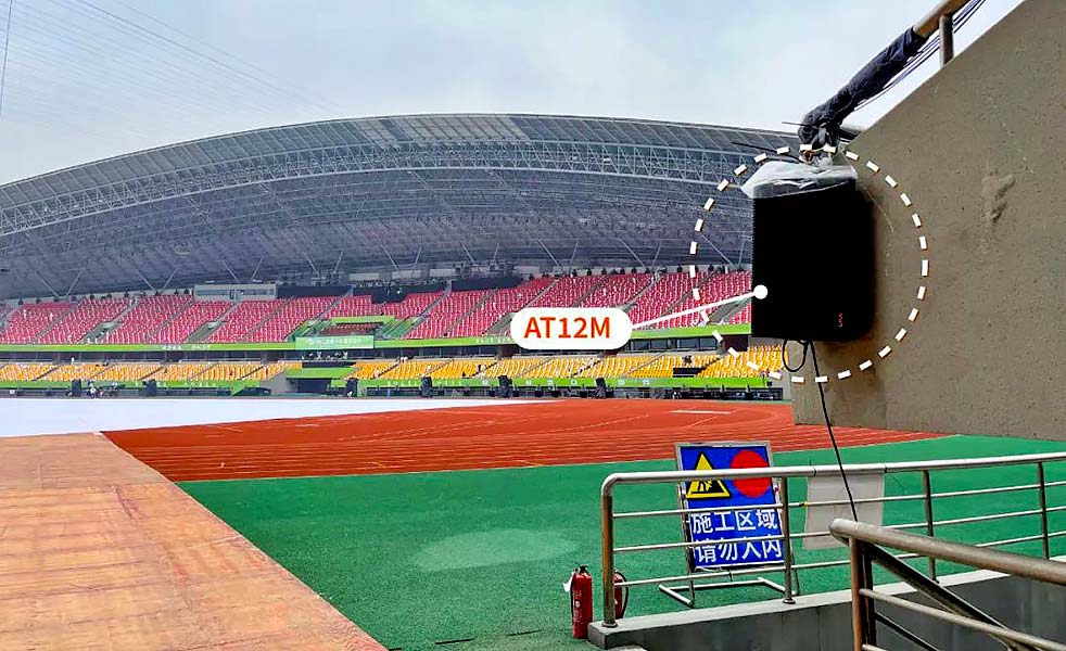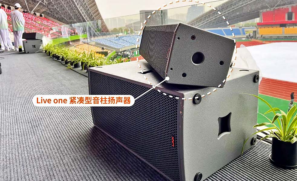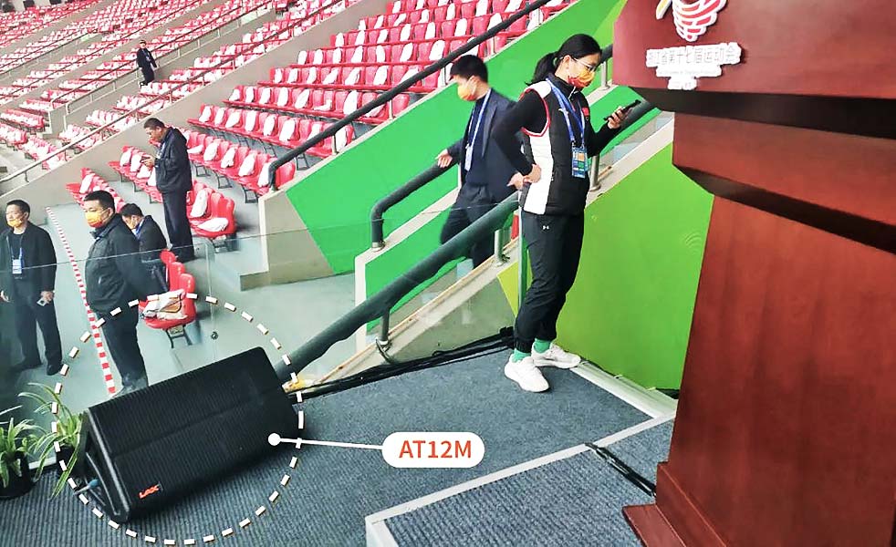 此外,為了讓主席臺位置有更好的觀看視角,場地方對主席臺做了專門的改造,在正前方增加了1米高左右的玻璃,原本主擴可以完全覆蓋主席臺,因為新增玻璃的遮擋,中高頻受到非常大的影響。因此迅速做出調整,在主席臺前方增加2組Liveone有源音柱,將全頻音柱水平放置在低音上,軸心對準主席臺中間位置,地面側補增加AT12M揚聲器,迅速解決了主席臺清晰度問題,同時完全沒有影響到主席臺的視覺效果。