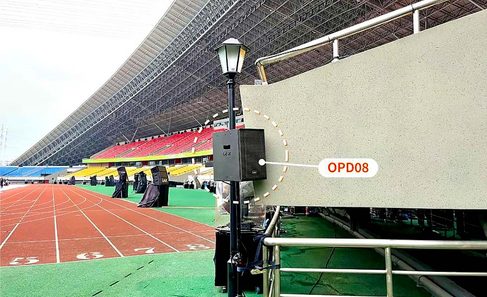 第二,舞臺區域做到了全區域聲音覆蓋而看不到音箱,給演員演出和投影畫面視覺呈現效果留出了最大的空間。舞臺返聽經過多方面考慮最終,選用了10只OPD12束波揚聲器,它具有身形小聲壓大的特點,在主擴旁邊支架安裝,覆蓋舞臺滿足演員返聽的需求。在舞臺后場上下場口增加了兩支OPD08作為候場演員的補聲,本次開幕式震撼效果完美的呈現,OPD的3D束波系列音箱功不可沒。