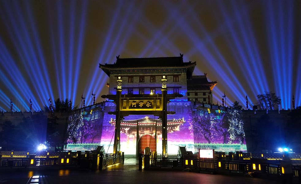 2018年國慶期間,西安永安門城墻用一場大型城墻光影秀《長安頌》,和全國人民一起慶賀祖國69歲生日。《長安頌》是國賓級禮儀文化演出《夢長安》的姊妹篇,依托西安的城市發(fā)展文化背景,分別展示:長安城初建、十三王朝的更迭與變遷、盛世大唐的文化魅力與舞姿唐詩的風(fēng)采、絲綢之路的文明交匯、現(xiàn)代西安的城市新面貌以及西安不斷開拓進(jìn)取,不忘初心的科技發(fā)展。此次演出由LAX音響相助,全方位展現(xiàn)西安十三朝古都、三千年文化積淀的人文歷史景觀,帶領(lǐng)觀眾穿過千年之門,認(rèn)識西安、了解西安,體驗(yàn)西安城市魅力。