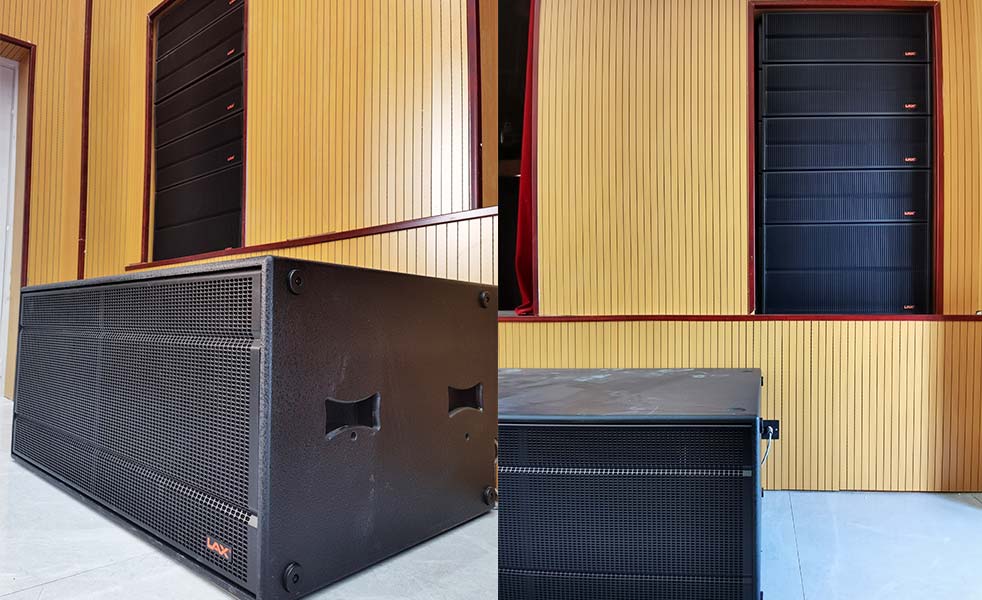 主擴聲選擇了LAX AT系列線陣音響,全頻4只+次低音1只+超低音1只組合,為了達到裝飾上的美觀以及設計上的聲學要求,選擇了隱藏式安裝在舞臺左右兩側,使聽眾區的邊角、后區都能擁有足夠的清晰度和聲場均勻度。