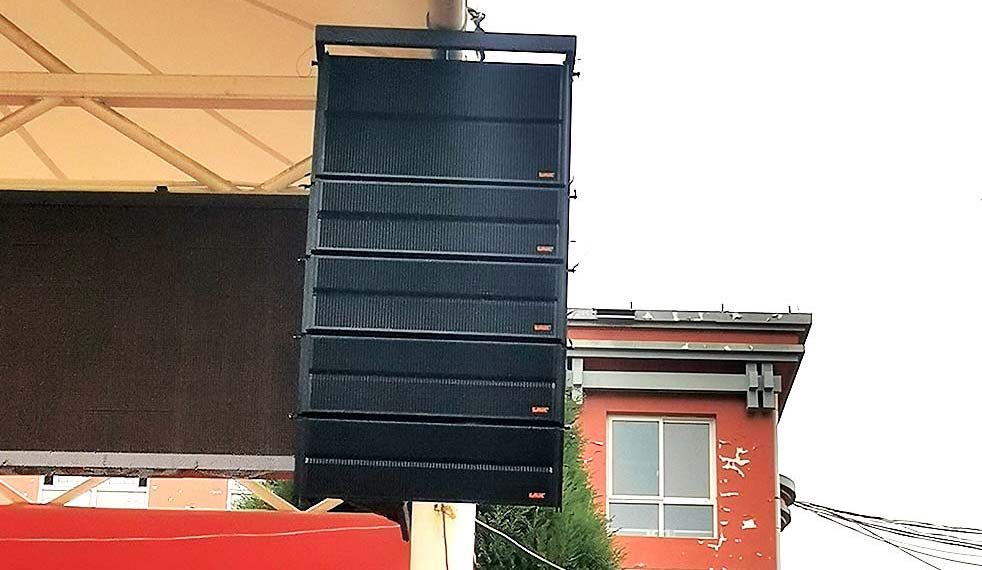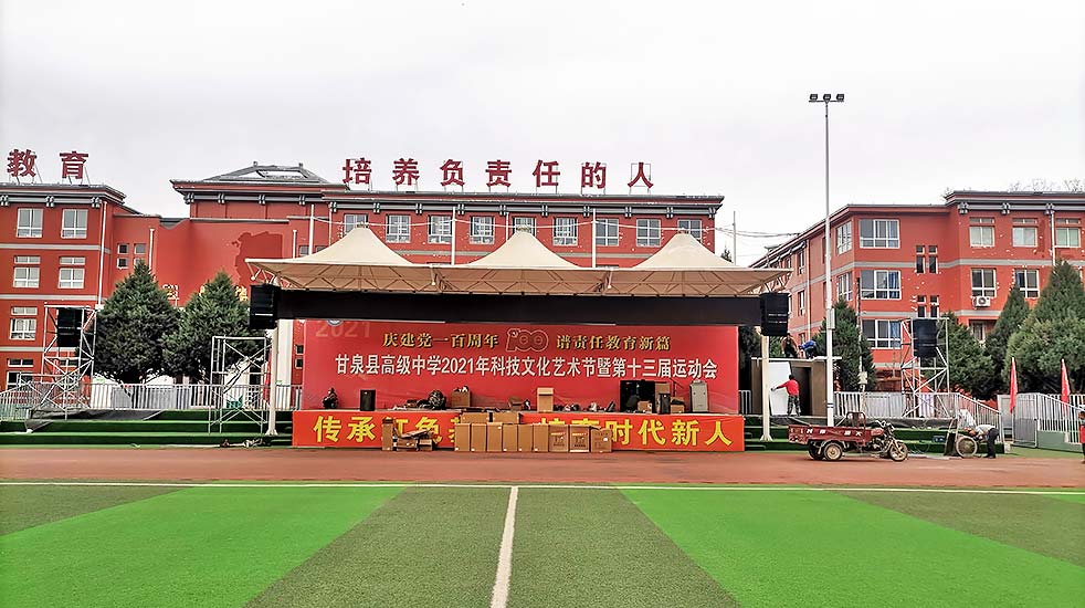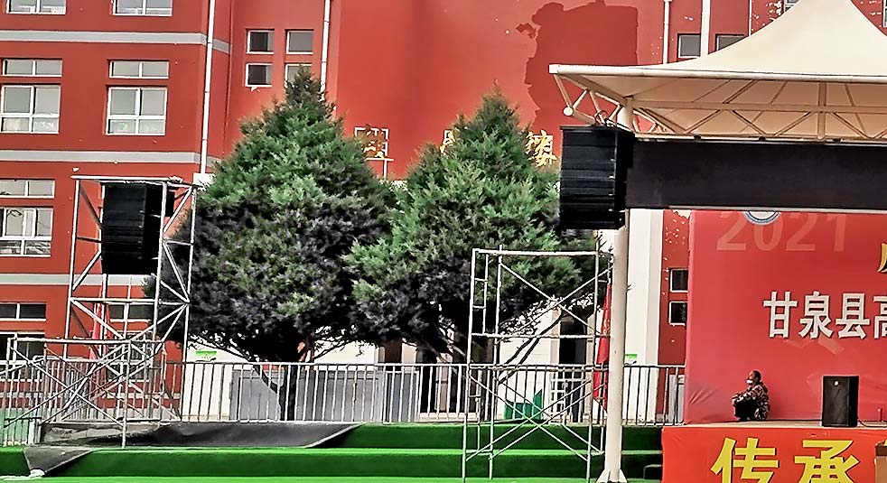 考慮到操場區域,要求聲場均勻,LAX選用4組(4只雙8線性陣列音箱AT208+1只雙15寸超低頻音箱AT215B)作為主擴音響吊掛在主席臺左右兩側,選用遠程號角音箱PS3作為觀眾席補聲吊掛在主席上方兩側,經過精確擴聲角度調整,能夠確保操場主席臺、觀眾區及運動場區域覆蓋均勻、聲音準確、音質清晰。