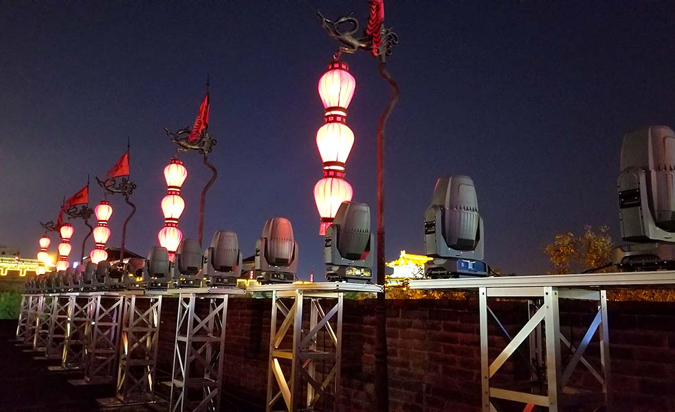 西南城角“嗨皮·陜博”光影秀,LAX AF110-P線陣列音箱搭配LAX AFL18B-P超低揚聲器使用,數字音頻處理器是DSP36而功放機產品是MT1300。PS108全天候全頻音箱作為返聽揚聲器,使用的是MPA4-500功放。