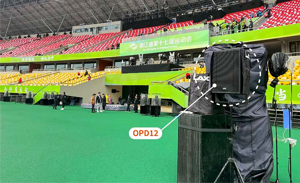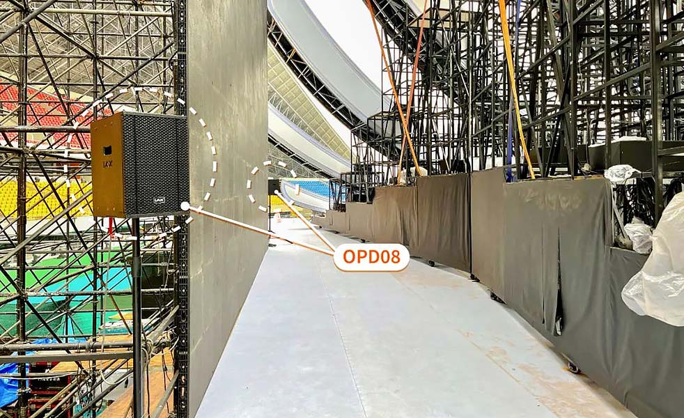 第二,舞臺區域做到了全區域聲音覆蓋而看不到音箱,給演員演出和投影畫面視覺呈現效果留出了最大的空間。舞臺返聽經過多方面考慮最終,選用了10只OPD12束波揚聲器,它具有身形小聲壓大的特點,在主擴旁邊支架安裝,覆蓋舞臺滿足演員返聽的需求。在舞臺后場上下場口增加了兩支OPD08作為候場演員的補聲,本次開幕式震撼效果完美的呈現,OPD的3D束波系列音箱功不可沒。