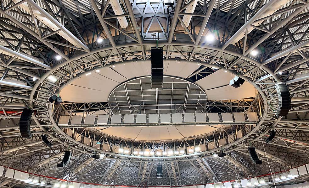 在體育館的東西南北四個區域,我們配置了23只LAX雙12寸3D束波全頻揚聲器,這些揚聲器均以高難度的方式懸吊在體育館的馬道之下。高性能揚聲器的均勻布局確保了整個觀眾席區域聲音實現充分的聲音傳播以及足夠的響度,從而使觀眾在觀看緊張刺激的賽事或活動時,能夠體驗到耳目一新、強烈震撼的感受,充分享受到最佳的音響效果。
