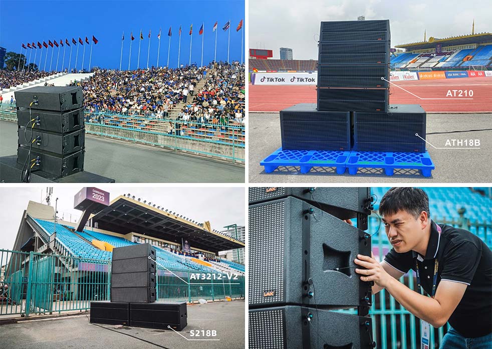 東南亞運動會足球揭幕戰于4月29日在奧林匹克體育場率先開打,根據場地條件以及足聯臨時要求,銳豐科技服務保障團隊緊急整合了5個場館線陣列音箱,共AT3212 16+8;AT210 ?32+16,與時間比速度,忍受40攝氏度的高溫,只用了半天時間把這個計劃外的系統搭建起來。足球揭幕戰柬埔寨以4:0先拔頭籌,賽后大家對現場音響效果都贊不絕口,直呼:“簡直就是在開演唱會一樣”。